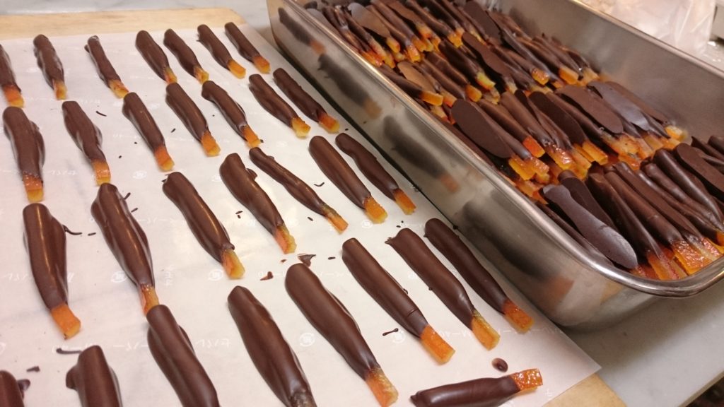 オランジェットはフランス産のオレンジピールをクーベルチュールでコーティングしました。ほろ苦いチョコレートに爽やかなオレンジが良く合います。